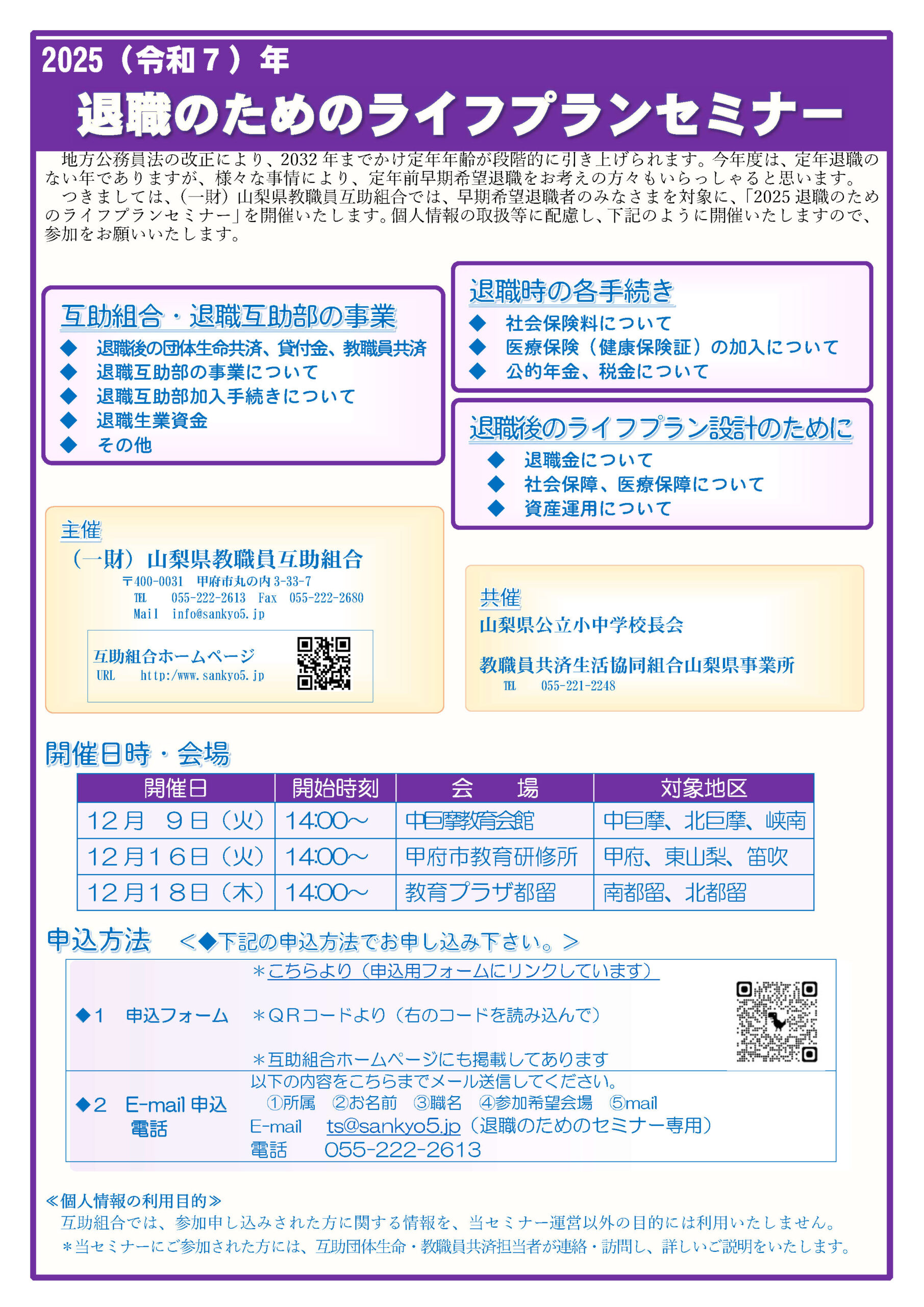 つきましては、(一財)山梨県教職員互助組合では、早期希望退職者のみなさまを対象に、「2025 退職のため